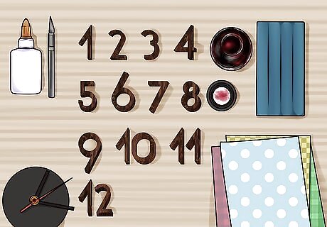 Determine where you will hang the numbers. Use a ruler to measure up one foot directly on top of the clock. Mark this spot with a pencil. This is where you will hang the number 12. Measure one foot to the right of your clock and mark it with a pencil. This is where you will hang the number 3. Measure down one foot below your clock and mark it with a pencil. This is where you will hang the number 6. Measure one foot to the left of your clock and mark it with a pencil. This is where you will hang the number 9.