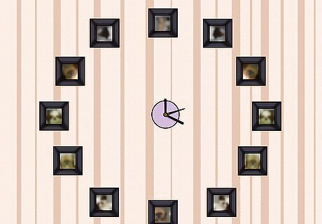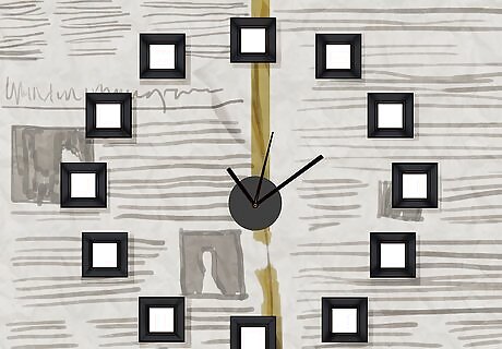 Hang the clock. Find a blank wall where you want to hang the clock. Use scotch tape to hang the newsprint tracing you made in step one on the wall. Use the frame tracings as a guide and hammer in the nails for each of the frames on top of the tracings you made. After you’re done hammering, pull the newsprint off the wall. The nails should stay in place and the paper should slide out easily. Hang up all the frames and clock piece. Place a AA battery in the clock piece and set the clock to the correct time.