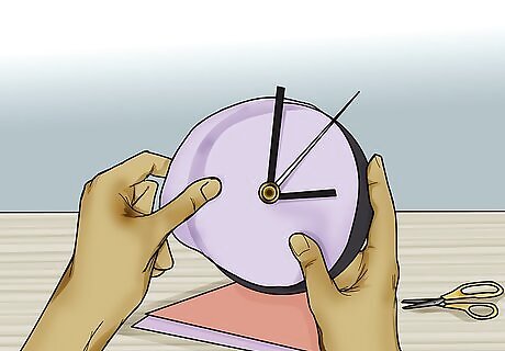 Assemble the clocks. Once the paint has dried on the trivet, slowly peel the tape off the trivet. Touch up any scuffs or marks and allow the touch ups to dry. Finish the clock by assembling the clock making kit. Make sure to set the clock before hanging it on the wall. Buy three times the supplies and make three times the clocks. Hang them in clusters on the wall or give the extras away as gifts.