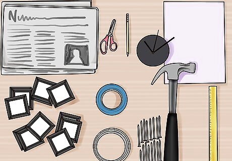 Gather the supplies. To make a photo clock, you will need the following materials: 2 sheets of 18”x24” newsprint or poster paper, tape, a pencil, 12 pictures frames measuring 2”x3”, 12 photos measuring 2”x3”, a clock mechanism kit, a ruler, a sheet of cardstock measuring 8.5”x11”, scissors, blue painters tape, a hammer and nails. Try mixing and matching different colors and styles of picture frames. A larger clock mechanism kit measures approximately 1 1/8" and costs around $10. This can be purchased online or in craft stores.