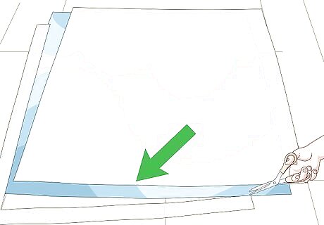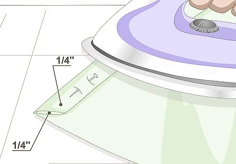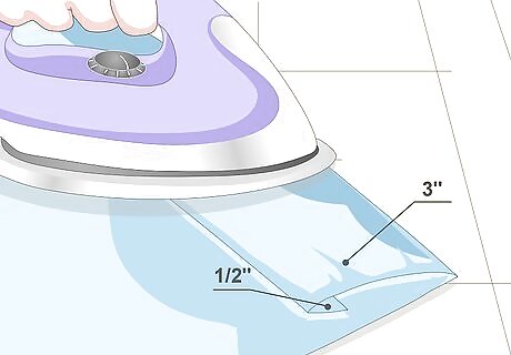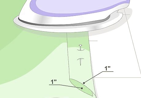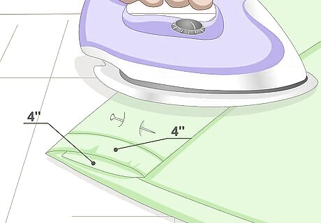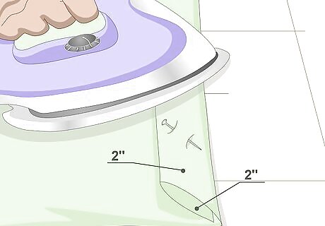 Fold the top and bottom hems down twice. Fold the hems down by 4 inches (10.16 centimeters) and press them flat with an iron. Fold them down by another 4 inches (10.16 centimeters), and press them once more. If you need to, use sewing pins to secure the fabric. If you are using iron-on hem tape: fold the edges down by 4 inches (10.16 centimeters) and iron the hem tape to the folded edge. Peel off the paper backing, then fold the hem by another 4 inches (10.16 centimeters). Press the hem flat with an iron.