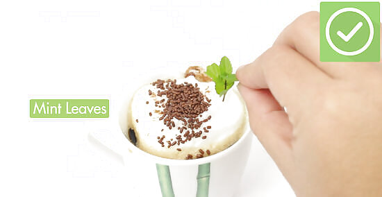 Finish it with a special garnish. Whipped cream is one of the most popular toppings for any dessert coffee, but you can also get creative and sprinkle some extra garnish on top of the whipped cream. When your coffee has been mixed to your liking with other ingredients, top it with whip, and then sprinkle it with something like: White, dark, or milk chocolate shavings Crumbled cookies Sprinkles Brownie or cake bites Chocolate or caramel sauce Fresh mint leaves Mini marshmallows