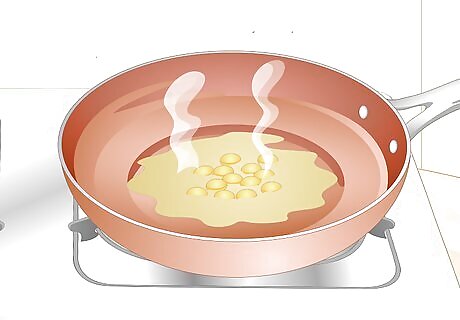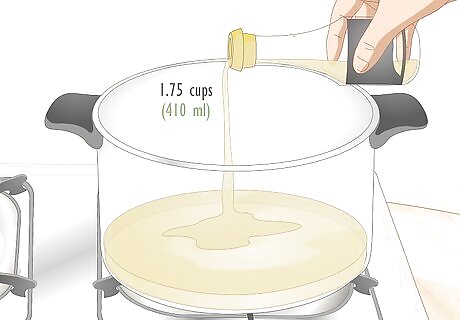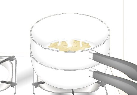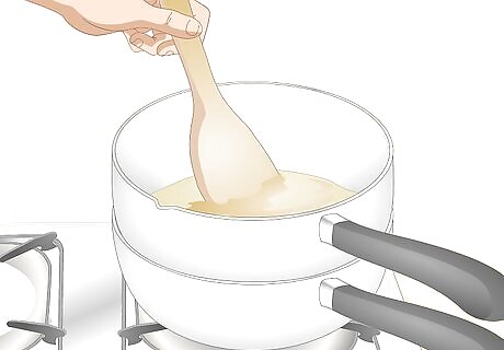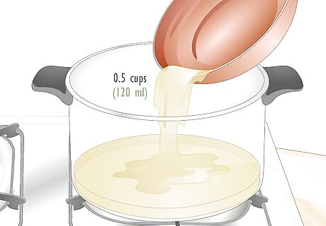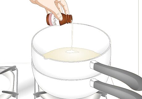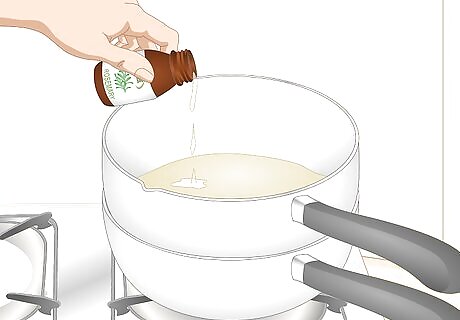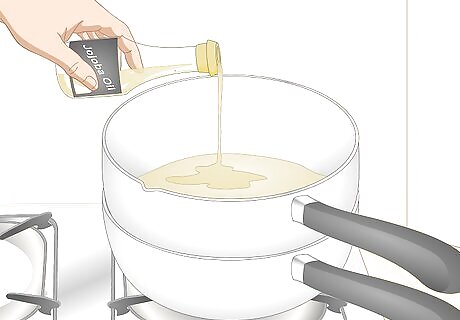 Melt wax and lanolin to create your base substance. Add 1 ounce (28 g) of lanolin and 0.5 ounces (14 g) of beeswax into the top of a double boiler. Set the stovetop to low heat, and wait several minutes for both substances to melt. If you’re only using beeswax as a base, make sure that the top boiler isn’t touching the hot water in the lower one. If you don’t have a double boiler on hand, feel free to use 2 similarly sized saucepans.