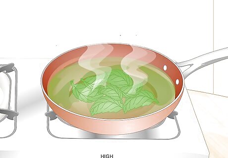 Infuse your dried herbs with water to make them more potent in the lotion. Take 1 ounce of dried herbs and 1 US pint (470 mL) of water and add them into a glass teapot. Once the water reaches a boil, pour the herbal mixture into a saucepan. Keep this pan covered on low heat, and let the herb mixture sit for at least 10 minutes. Separate the water from the herbs, and set the mixture aside for later. Try to make your herb infusion the same day you plan to prepare the lotion. If you don’t plan on using the mixture right away, store it in your fridge for up to 1 day.