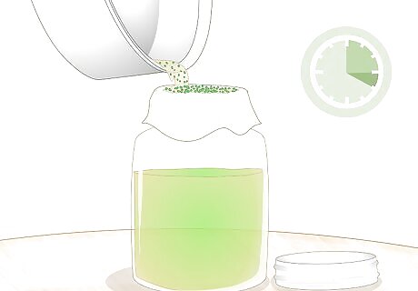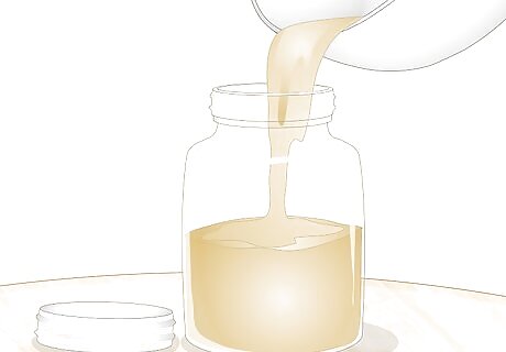 Strain the oil for at least 3-4 hours. Set a piece of cheesecloth over the mouth of a glass jar or other glass container. Pour the herbal oil over the cheesecloth, letting it strain and fill the glass container. Chances are, you’ll have made more oil than you need for one batch of a salve, so you can use the jar to store leftover herbal oil later. You might find a grainy substance, solids, or sediment left over in the cheesecloth. Feel free to compost this or toss it out. You can also let the oil strain overnight.