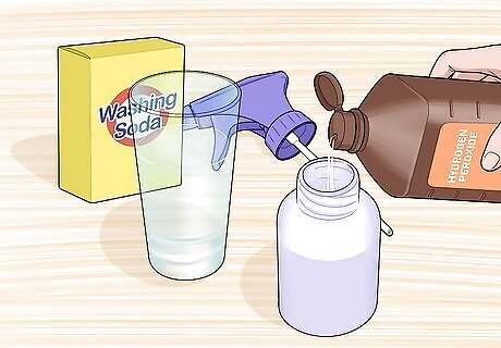 Add the washing soda, hydrogen peroxide, and your usual laundry detergent. Stir the ingredients together with a wooden spoon or your hand. If you have sensitive skin, consider wearing a pair of rubber gloves so that the solution doesn't irritate you.