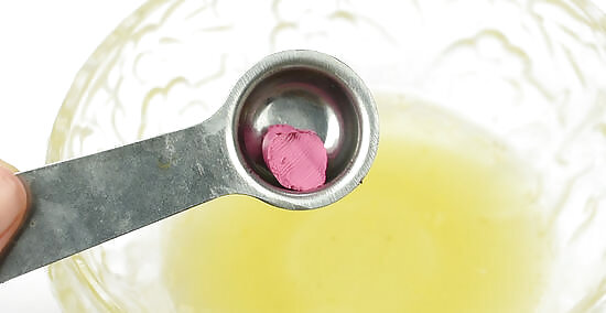 Add 1 tsp of lipstick to the bowl with the vaseline. Use less lipstick to give your gloss just a tint of color, or use more lipstick to create a deeper shade of gloss. Simply cut away a small piece from a tube of lipstick and add it to the mixing bowl. If you don’t have lipstick, you could also use eyeshadow or blush to add color to your lip gloss. You could also add 1 to 2 drops of your favorite essential oil or a small pinch of glitter to the mix at this time, too.