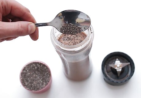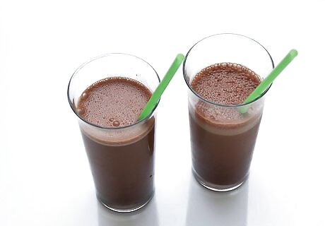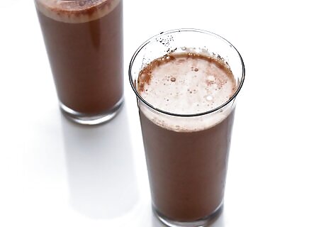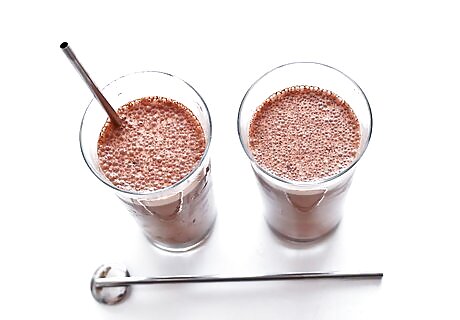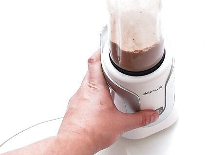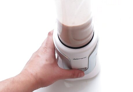 Blend the mocha protein smoothies. Put the lid on the blender and blitz the smoothies until the ingredients are combined. Remove the lid and pour the smoothies into two large glasses. Serve the smoothies immediately before they begin to separate. If you want thicker smoothies, consider adding a few handfuls of ice before blending them.