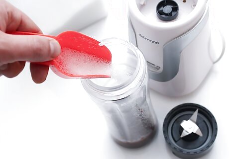 Measure out the ingredients. Measure out and place the smoothie ingredients into the blender. Pour the milk in first, followed by the powders and then the yogurt. This will help your blender combine the smoothies easily. For two mocha protein smoothies, you'll need: 8 to 12 ounces (226 to 340 g) of plain or vanilla Greek yogurt 2 teaspoons of espresso powder, ground coffee, or instant coffee 2 teaspoons of unsweetened cocoa powder 2/3 to 1 cup (160 to 240 ml) of milk 2 scoops of protein powder