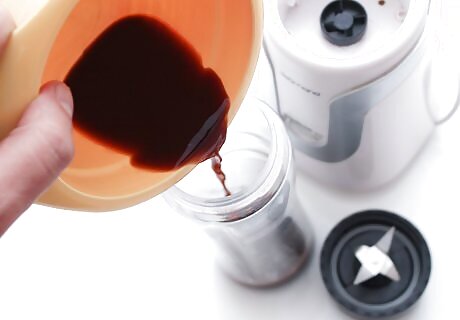 Dissolve the instant coffee powder. Place 1 tablespoon of instant coffee powder and 3 tablespoons of instant mocha flavored coffee and into a small mixing bowl. Pour 3/4 cup (180 ml) of milk over the powders. Use a small spoon to stir the milk and powders until they dissolve. Pour this liquid into a blender. Dissolving the powder ensures that the flavor is fully developed before you blend the smoothies.