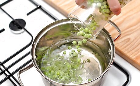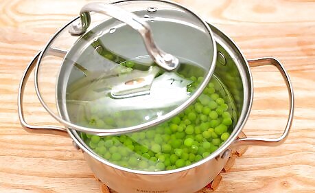 Boil the peas in a saucepan. Be sure that the water level is just enough to cover the peas.