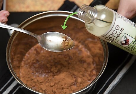 Add the coconut oil, cocoa powder, maple syrup, and sea salt into a small saucepan. The coconut oil will give the hot chocolate a creamier texture. The sea salt will help cut down on the sweetness, and bring out the flavor of the chocolate. If you like your drinks really sweet, omit the sea salt. Make sure that you use refined coconut oil, or you will get a coconut flavor, which may not work well with peppermint.