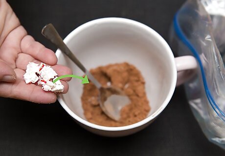 Add the crushed candy cane into the mug. Unzip the plastic bag, and carefully tip the crushed candy into the mug. Consider saving a little bit to use as a garnish later.