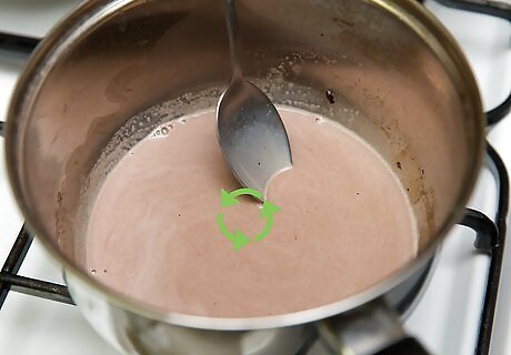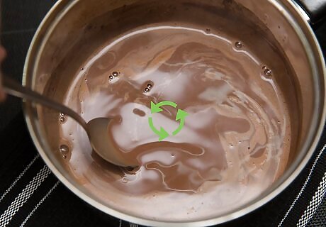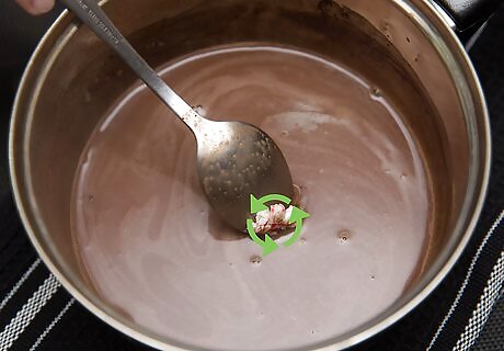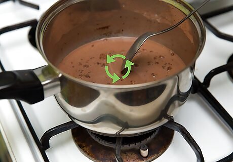 Heat the chocolate and milk over low heat until the chocolate melts. Stir the mixture from time to time so that it does not scorch. You can use a whisk or spatula. Don't let it come to a boil, or the chocolate will burn.