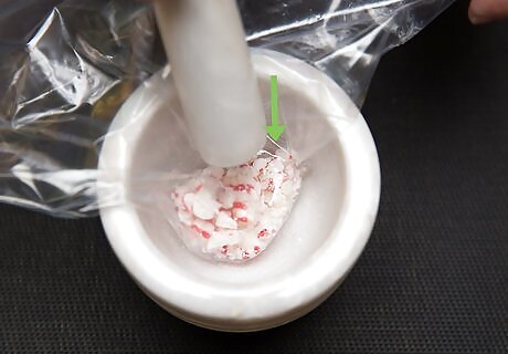 Crush a candy cane into small pieces. Put a candy cane in a plastic, resealable bag. Whack the candy with a hammer or rolling pin until it breaks into small pieces. Try to use the kind of zippered bag you'd put into your freezer. It'll be more durable because it is made from thicker plastic.
