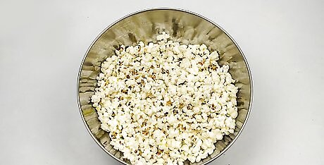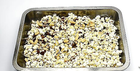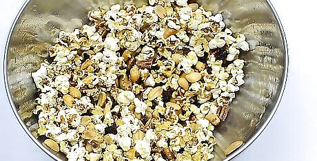 Combine the popcorn, peanuts, and dried fruit. Add 8 cups (64 g) of popped popcorn, 1 cup (125 g) of salted peanuts, and 7 ounces (198 g) of mixed dried fruit bits to a large bowl. Toss the ingredients to ensure that they’re fully mixed. Make sure to pick out any unpopped or burnt kernels from the popcorn. You can substitute your favorite nuts, such as walnuts or cashews, for the peanuts. You can usually find dried fruit bits with the raisins and dried cranberries at the grocery store.