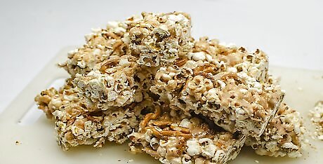 Mix the popcorn and pretzel pieces. Add 10 cups (80 g) of popped popcorn that’s lightly salted and 40 small pretzel twists that have been broken into pieces to the large, greased bowl. Toss the ingredients lightly to ensure that they’re completely mixed. You can air pop your own popcorn or use microwave popcorn. Just make sure to choose an unbuttered version. Any type of unflavored pretzels will work for the popcorn bowls. For example, you might use plain, whole wheat, or honey wheat pretzels depending on your preference.
