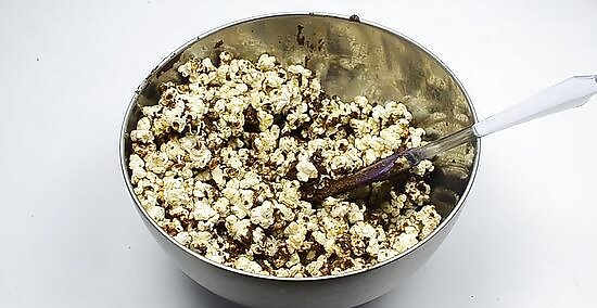 Pour the peanut butter mixture over the popcorn. When the peanut butter and chocolate mixture is fully blended, add it to the bowl with the popcorn. Stir the mixture with a spatula or wooden spoon to ensure that the popcorn is fully coated.