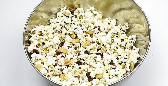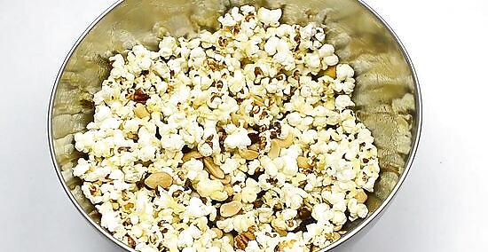 Pour the honey mixture over the popcorn and toss to coat. While the honey mixture is still hot, add it to the bowl with the popcorn, peanuts, and dried fruit. Use a wooden spoon or spatula to toss the ingredients so they’re evenly coated with the honey mixture. Be careful when tossing the popcorn because the honey mixture will be extremely hot and may burn if it gets on your skin.