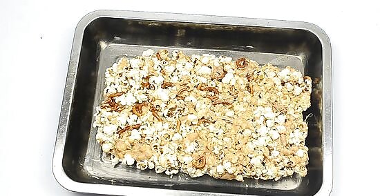 Press the popcorn mixture into the baking dish and cool completely. Once the popcorn and pretzels are coated with the caramel mixture, use the spatula to transfer it to the greased baking dish. Press the coated popcorn down, and allow it to cool completely, which should take 30 minutes to 1 hour. Make sure that the popcorn is in a single, even layer so it’s easier to cut the mixture into bars.