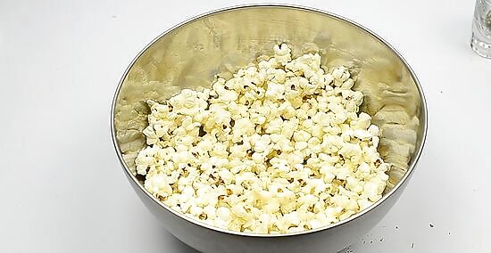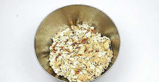 Pour the caramel mixture over the popcorn and pretzels and toss to coat. When the caramel mixture is fully melted and blended, add it to the bowl with the popcorn and pretzels. Use the greased spatula to toss the mixture well so the popcorn and pretzels are coated with the caramel mixture. The caramel mixture may be hot, so be careful not to get any on your skin.