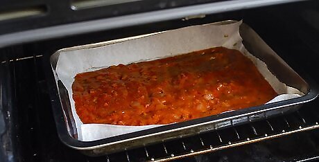 Bake the tomato paste until it darkens. Place the baking sheet in the preheated oven. Let the paste bake until it becomes a deep brick red color and no longer looks shiny, which should take approximately 2 hours. The paste will resemble fruit leather when it’s finished baking.