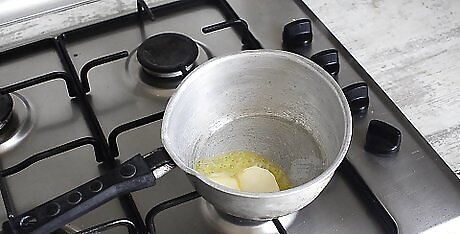 Melt the butter on the stove. Add 2 tablespoons (28 g) of unsalted butter to a medium size saucepan. Heat the butter on medium on your stovetop until it melts completely, which should take 2 to 3 minutes. Stir the butter to help it melt evenly.