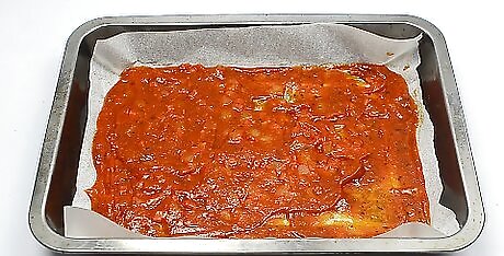 Spread the tomato paste on the parchment paper. Open a 6-ounce (170 g) can of tomato paste. Use a small offset spatula or butter knife to spread the paste in a thin layer over the parchment paper on the baking sheet.