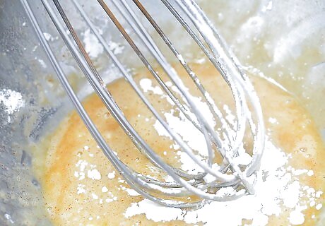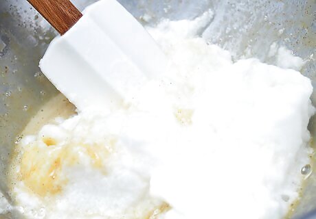 Fold the egg whites into the yolk mixture. Gently use a spatula to fold the egg whites into your sweetened yolk mixture. This should give the mixture some volume. To fold the egg whites, hold your spatula and slice straight down through the center of the egg whites. Scoop the batter and fold the egg whites in a circular motion. Turn the bowl a little bit and keep doing this until the whites are incorporated into the batter.