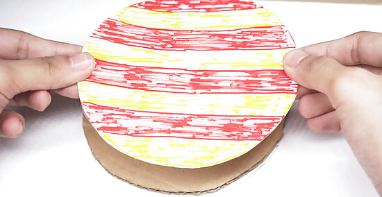 Draw a spiral on a circular piece of cardstock. Cut the cardstock into a large circle if necessary. Make the spiral large enough to cover the entire page. Start at the edge of the cardstock and continue the spiral to the middle point of the circle. Keep your pen on the paper for the entire swirl to ensure that the line is continuous. If you want to use a template, search online for a free whirligig spiral template and then press print. If you want a colourful whirligig, use coloured cardstock or draw patterns on the paper. Purchase circle paper from a craft store, or trace a tin and make your own.