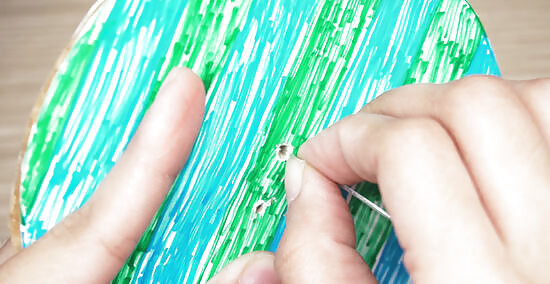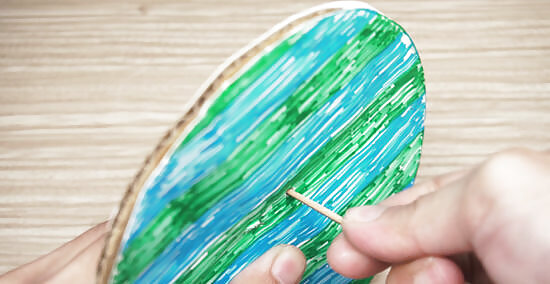 Poke 2 holes in the middle of the whirligig about 0.5 inches (1.3 cm) apart. Most templates will have 2 dots in the middle of the whirligig that indicate where to make the holes. If your template doesn’t have dots, simply estimate where the middle of the whirligig is and draw the 2 dots yourself. Carefully push the skewer through each dot until it reaches the other side of the cardboard. Don’t worry about marking the whirligig with the dots, as the dots will disappear when you poke a hole through them. Purchase skewers from a supermarket or a kitchen store.