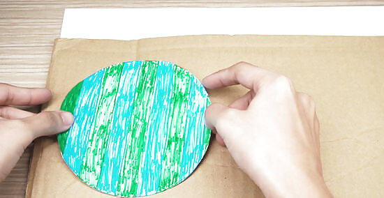 Stick the other template onto the blank side of the whirligig circle. Place the remaining template onto a piece of scrap paper and cover the back side with glue. Stick the template onto the blank side of the whirligig circle and move it around until it is positioned in the centre of the cardboard.