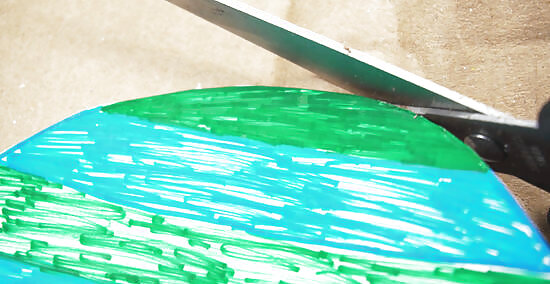 Cut around the outside of the template to create the whirligig circle. Use scissors to cut out the circle whirligig. Try not to cut the template, instead cut just outside the template line. If you have trouble cutting the thick card, use a sharper pair of scissors.