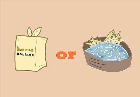 Feed haylage or soak hay for a few minutes. This helps to cut down the normal dust/pollens that are present in dried hay. Soak only long enough to get the hay thoroughly wet, as soaking any longer can actually reduce the starch and sugars that are normally present in the hay, which are needed for proper nutrition. If you happen to have an overweight or laminitic horse, you may want to soak the hay in water for a bit longer, as reduced starch and sugar can be a good thing.Manage a Horse with Breathing Problems Step 7Bullet1.jpg