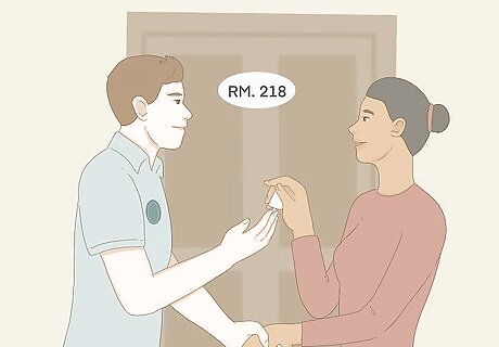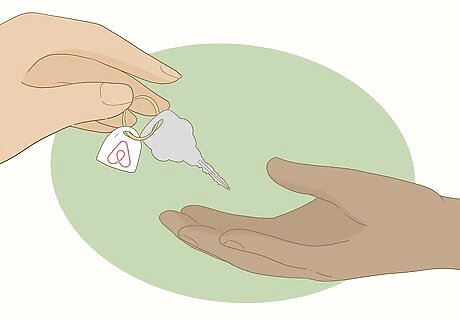 Message the guests the day before their stay and give the key over. The day before your guests are set to arrive, explain how and when they can pick up the key. Include additional information about your unit as needed, like it it’s hard to find the door or the top lock tends to stick. If you’re meeting them in person, show up on time and be kind as you walk them through the unit and show them where everything is. Some hosts install keyless doors and simply give guests the code. Other hosts use a lockbox to hide a key in front of their property. Most hosts choose to meet the guest in-person though to walk them through the unit and answer any questions.