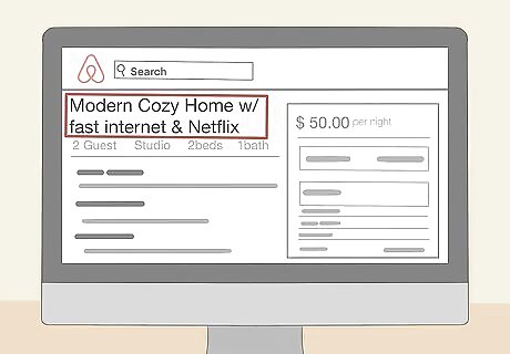 Write an exciting description that accurately describes the property. To give potential guests a little insight into what your home is like, start by mentioning the location, size of the property, and overall personality of your space. Then, compose 1-2 paragraphs that detail the amenities and benefits of your property. Keep in mind, it’s better to be upfront about the size and quality of your property, so be honest about any downsides. For example, a quality overview may read, “Large 3-bedroom condo, 12 minutes from Downtown Seattle!” or, “Cozy studio apartment in the heart of Barcelona’s Bohemian District.” A good description may start, “This recently-renovated cabin has large bedrooms, queen-sized beds, and exposed-brick walls. It’s the perfect weekend destination for a couple looking to get away or a few friends hoping to reconnect over the grill. Lots of space, a beautiful lakefront, and unlimited access to the kayaks out back. Keep in mind, you must be verified to rent this space.”