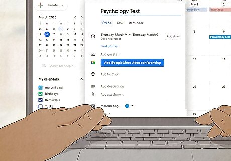 Set reminders. It’s all too easy to miss deadlines or forget about study sessions. You’re a college student--you’ve got a lot going on! Use your phone or an online service to set daily, weekly, or special reminders for yourself. You could even go old school and leave post-it notes in places you’re likely to see them, like on your desk, door, or computer screen.
