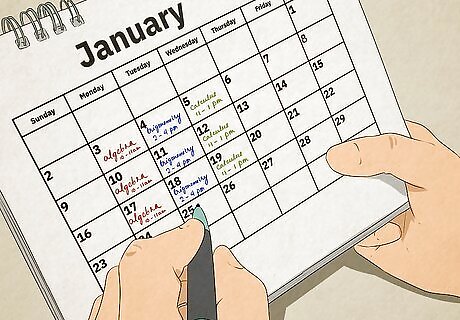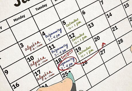 Sketch out deadlines for your semester. Once you’ve got your hands on the schedules for all of your courses, put all assignment due dates, exams, and homework on your calendar. This will help you be aware of what weeks or months of the semester will be particularly busy so you can plan ahead. If you know in advance that you’ve got three midterms in one week, you’ll tell that friend who asks you to go on a weekend trip that you can’t go until later.