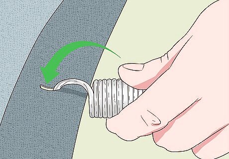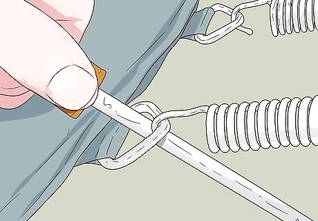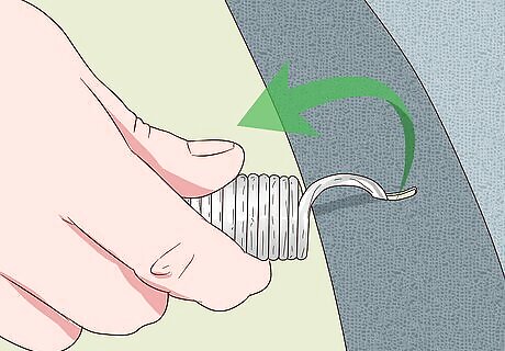 Use a screwdriver or a T-hook to attach the second hook. Slide the long end of a screwdriver or the T-hook into the other hook on the spring. Then, pull it slightly and slide the end of the screwdriver or T-hook into the loop on the trampoline mat. The hook on the spring should slide into the loop as well and pop in place. You may need to use both hands on the handle of the screwdriver or the T-hook to slide the hook into the loop. You can order a T-hook made for replacing trampoline springs online through trampoline retailers or at your local hardware store.