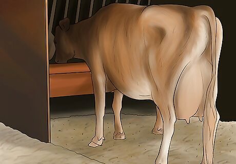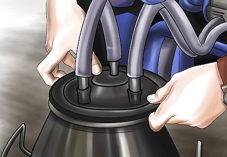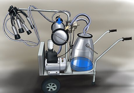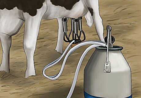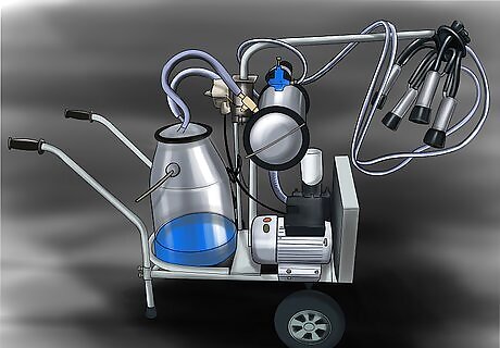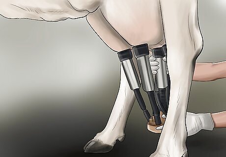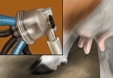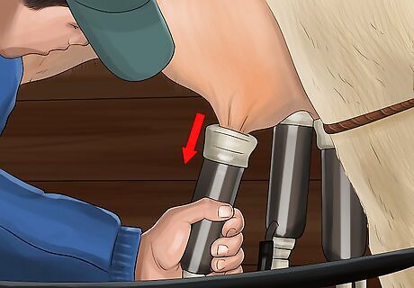Move the bucket or bucket-milker unit beside the cow next to her rib cage. The bucket, especially if you have one that you are not moving around on the trolley, should be placed on the ground next to the cow. This leaves you room to access the cow's udder more easily.