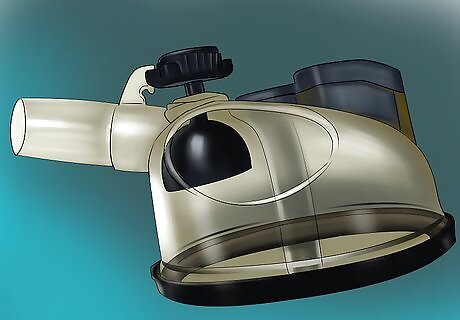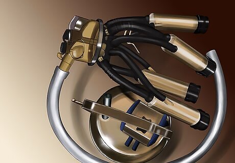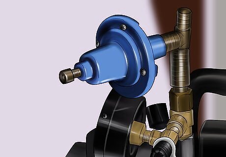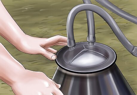 Hook up the vacuum line to the vacuum port on the milker and turn on the vacuum pump. If you have a DIY milker (those you can make yourself with proper parts to create a good vacuum pump) that operates from an electrical outlet, plug the pump in then turn it on. If you're running the pump from a little motor then the similar applies as above, to attach the line to the port on the milker before turning on the motor to the pump. Some milkers may need some time to build up the negative pressure needed to begin milking, and to get the pulsator going in the inflations (or suction/teat cups). The pressure should reach around 0.04 kPa before putting the cups on. Remember to make sure all connections are secure and attached before turning anything on.