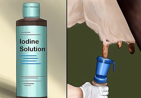 Dip the teats with a 70% Iodine solution. Wait for a couple minutes for the solution to dry, then gently dab any excess iodine off from the end of the teat with a clean rag or paper towel. Do not touch the teats afterwards.