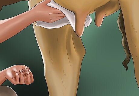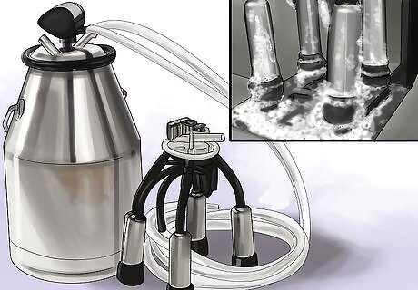 Clean the udder thoroughly. Using a clean rag or paper towels, clean the teats and lower part of the udder of dirt and debris. As you do so, gently yet firmly, just like if you were hand-milking, squeeze each teat in a downward motion to initiate milk let-down and to dislodge any plugs that may be accumulated at the end of each teat. This may not be necessary if the udder is already so full that the teats are leaking milk. Discard the rag or towel.