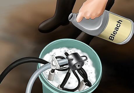 Clean the machine afterwards. Get a pail of water with a couple cups of cleaning solution (cold water is best), and put the suction cups open end down into the pail, then turn on the machine. The machine will actively suck the water and cleaning solution through the hoses into the bucket, until the pail is empty. Repeat with plain clean water afterwards to wash out any residue chemical.