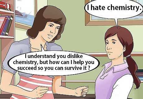 Ask your teen questions. If your teen gets a poor grade on a test, do not berate him. Instead, ask him questions. What do you think happened to cause this? Did you have enough time to study? Did you feel like you understood the questions? Did you get nervous during the test? Often, teenagers feel demotivated when they do poorly in school, but they may not realize why they're doing poorly. Know what is actually important to your teenager. If your teenager says "I hate chemistry," for example, you do not need to correct him by saying, "No, you don't." Everyone has subjects that come more naturally to them, and it's okay to lack interest in one area. However, try to help your teenager learn to succeed despite reservations and help him see how getting a decent grade in a subject he dislikes can help him long term. Say something like, "I understand you dislike chemistry, but how can I help you succeed so you can survive it?" Often, teenagers will say they "hate" a subject because they don't understand it. Ask questions about what your teen hates. This will help you determine whether something like tutoring or even extra help with homework could be helpful.
