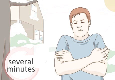 Keep your extremities warm. Even if you're just wearing a t-shirt, keeping other parts of your body can warm your overall internal core. Blow hot air into cupped hands and rub them together. Outer extremities are the first to develop damage from cold temperatures. These consist of your toes, fingers, ears, and nose. Extremities don't have the muscle or blood flow to keep them as warm as the rest of your body. Keep these areas warm to avoid freezing injuries like frostbite.