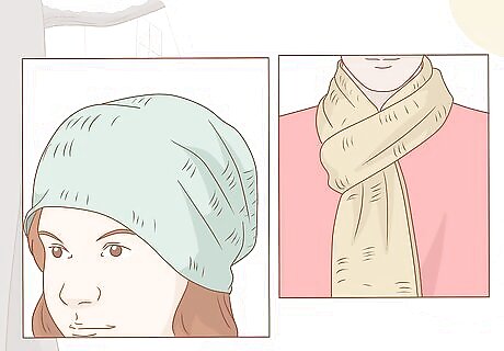 Wear a hat. Although all parts of your body release heat, your head and neck are often exposed which releases major heat. Wear a hat and scarf to keep the heat trapped and circulate throughout your body. Any enclosed hat will do, but avoid visors. If you can, wear a beanie or a hat that covers your ears. Your ears are one of the first parts of your body to experience damage to cold temperatures.