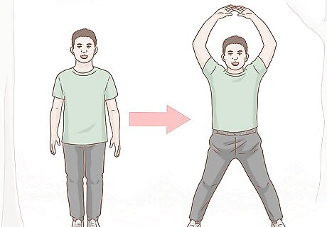 Move around. A good way for a quick warm-up is a quick warm-up. When you're active, your body's blood circulation increases, which causes you to warm up. Here are some standing exercises to keep warm while outside: High knee kicks. Place your hands in front of you and kick your knees up to your hands. Jumping jacks. Torso twists. Keeping your elbows lifted, twist your upper body from side to side at a moderate pace. Dance. If the occasion calls for it, don't be afraid to dance to the music!