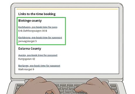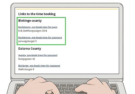 Book an appointment to apply for a passport. You must apply in person for your passport at the nearest police station. Most police stations require an appointment. Even if an appointment is not required, it's a good idea to go ahead and book one to cut down on your wait time. To book an appointment at the nearest police passport administration office, go to https://polisen.se/tjanster-tillstand/pass-och-nationellt-id-kort/boka-tid-hitta-passexpedition/ and select the location nearest you. There are also some police passport administration offices that have drop-in service.