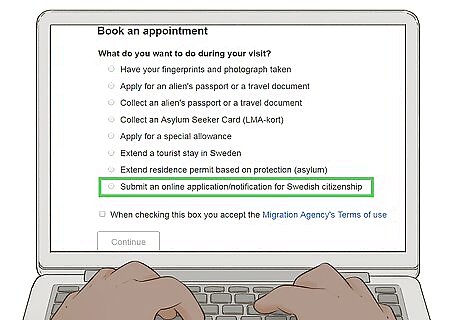 Book an appointment with the Swedish Migration Agency. An official at the Swedish Migration agency will interview you and ask you questions about your application. This interview will be conducted completely in Swedish and also assesses your Swedish language skills. To book your appointment, go to https://www.migrationsverket.se/en/contact-us/book-an-appointment.html and select "Submit an online application/notification for Swedish citizenship." Check the box to accept the terms of use, then click "Continue." After you've booked your appointment, you'll see a checklist of documents to bring and what to do to prepare yourself for the appointment. You may want to print it out so you can refer to it later.